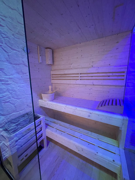 La jacuzzi circondata da candele profumate, offre un'esperienza di benessere mentre la sauna, con legno pregiato e luci soffuse regala un calore avvolgente.